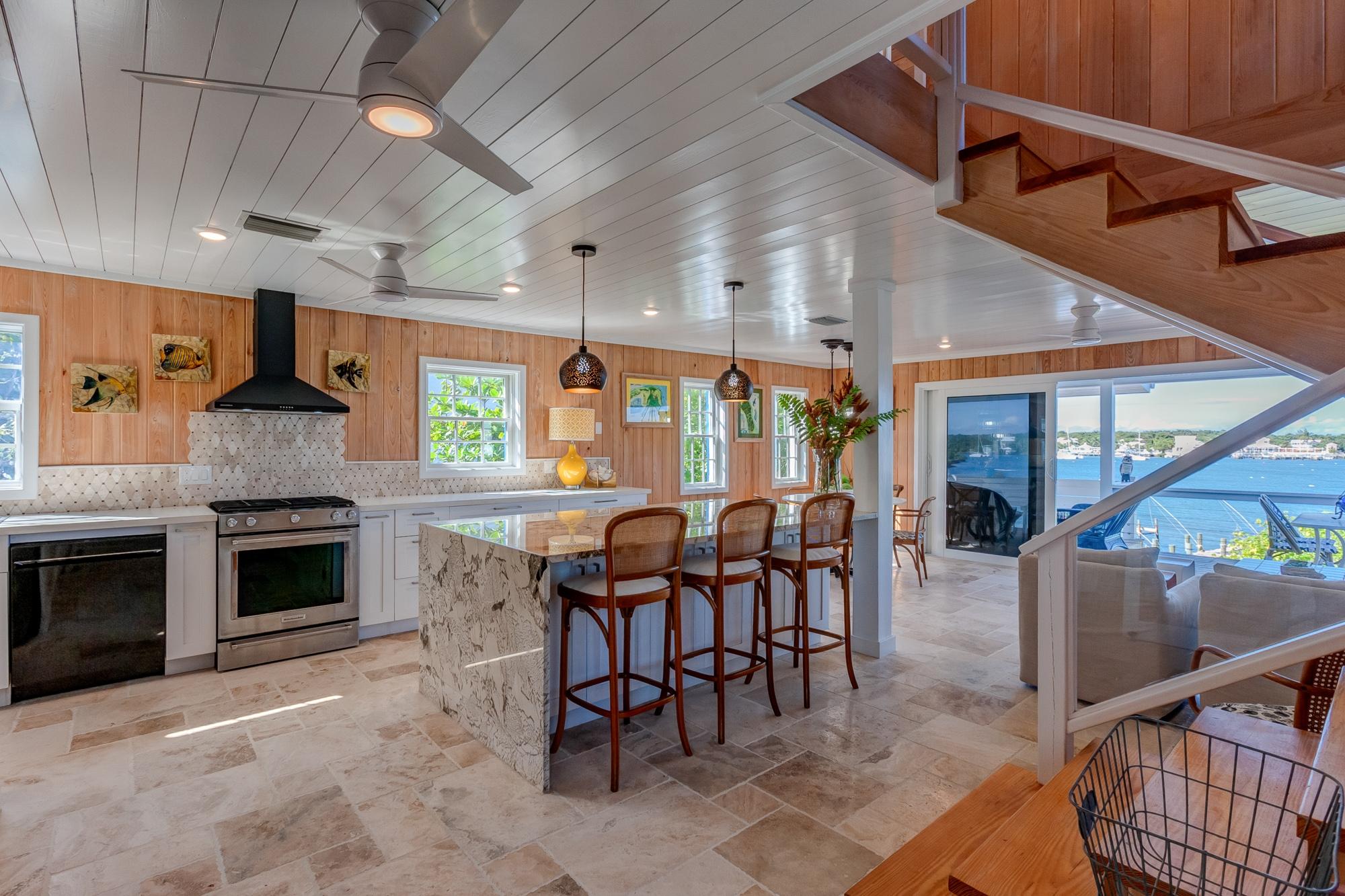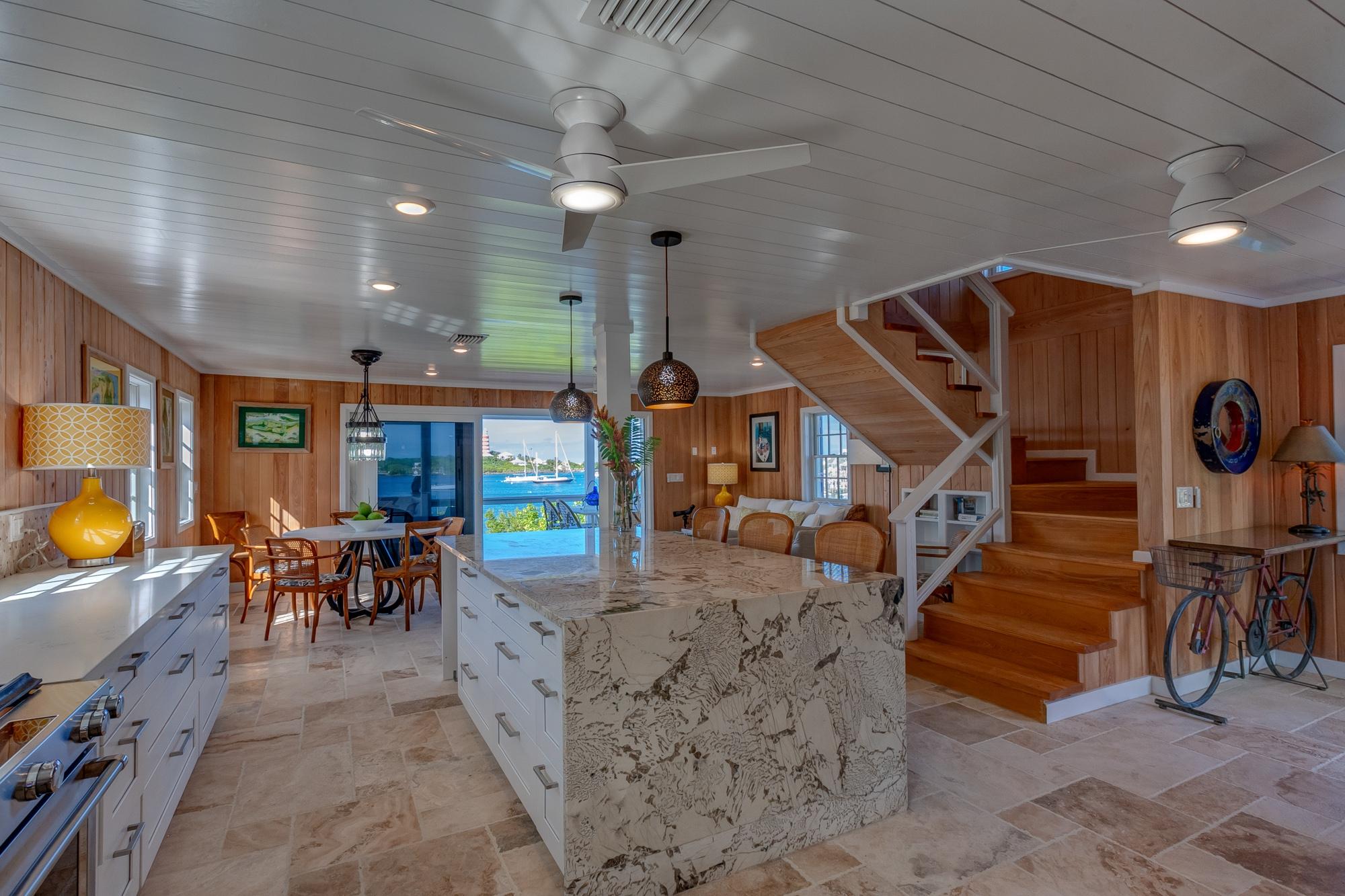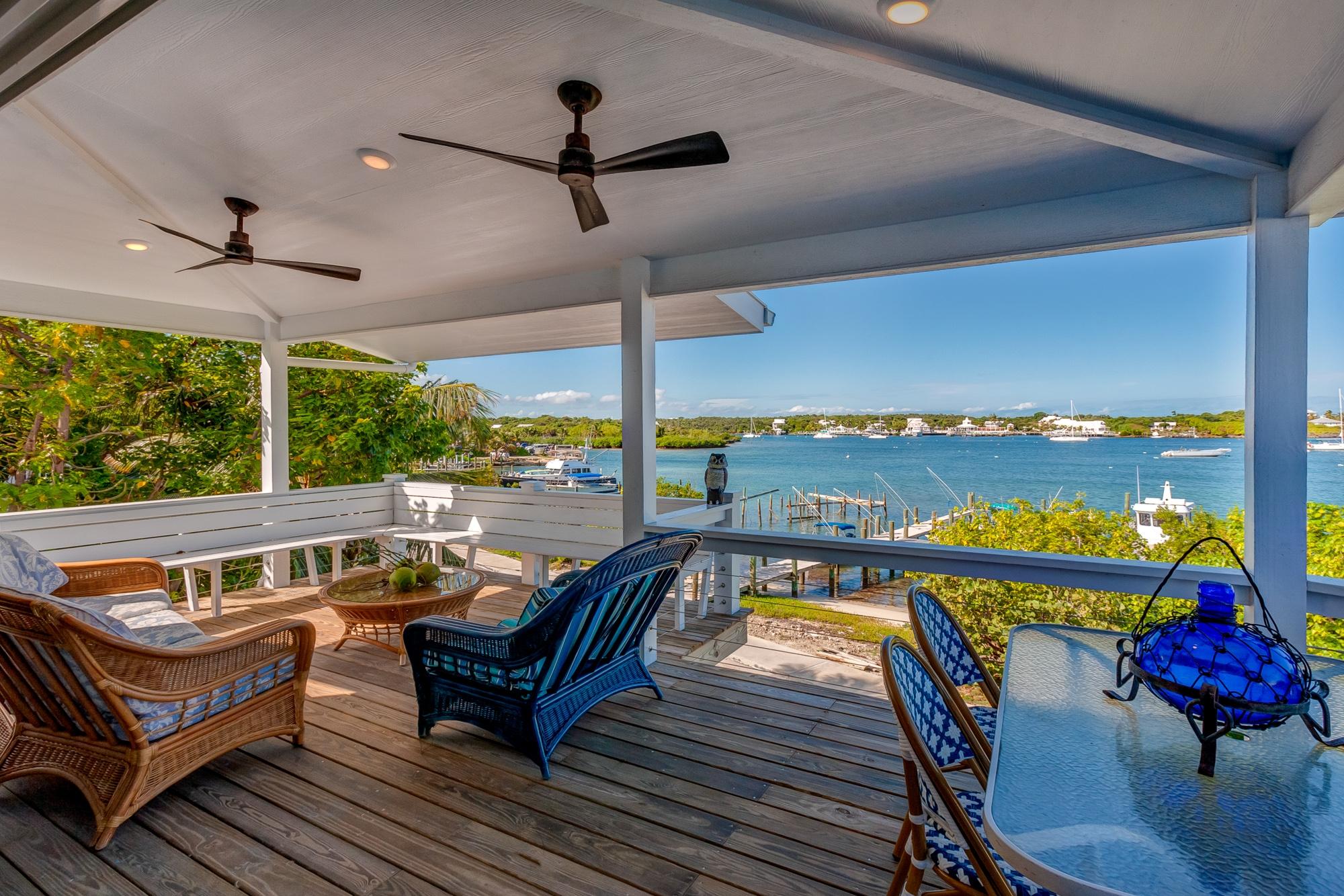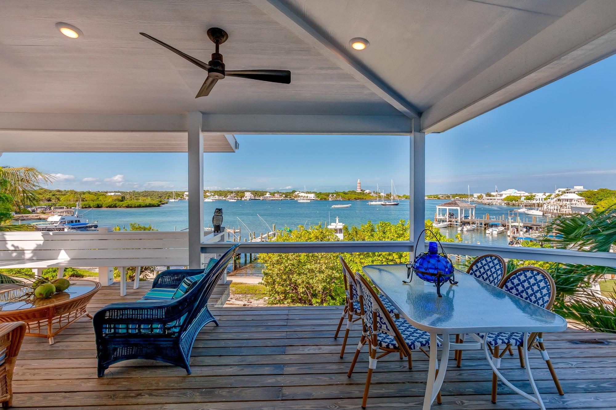 HOPE TOWN HARBOUR LOCATION with DOCK SLIP. Own one of the few harbourfront homes in the village with front row seats to the bustling harbour and only steps away from your own 27 ft dock slip. Beautifully elevated with the focal point of the home being a fabulous front deck overlooking the harbour and village. From sunrise to sunset, enjoy perfect panoramas of the lighthouse from the west side, and ocean views from the east. The tranquil white sand beaches of the Atlantic are only steps away. Newly renovated, it holds the perfect blend of modern living and island charm. A very comfortable home that compliments the genuine slow pace of island life. With 1356 sq. ft of finished floor space, the main floor features an open concept living and dining area, cozy family room, and charming eat-in kitchen. Modern stainless appliances, gas range, new cabinetry and butler’s pantry off the kitchen. Expansive glass doors open to the covered deck that offer extraordinary space for seamless indoor to outdoor living. The 2 bedroom suites upstairs each have ensuites and more incredible views. Turnkey.