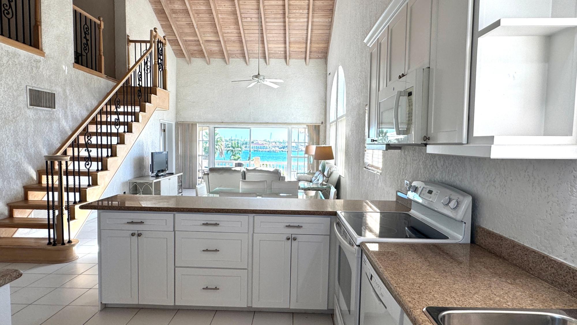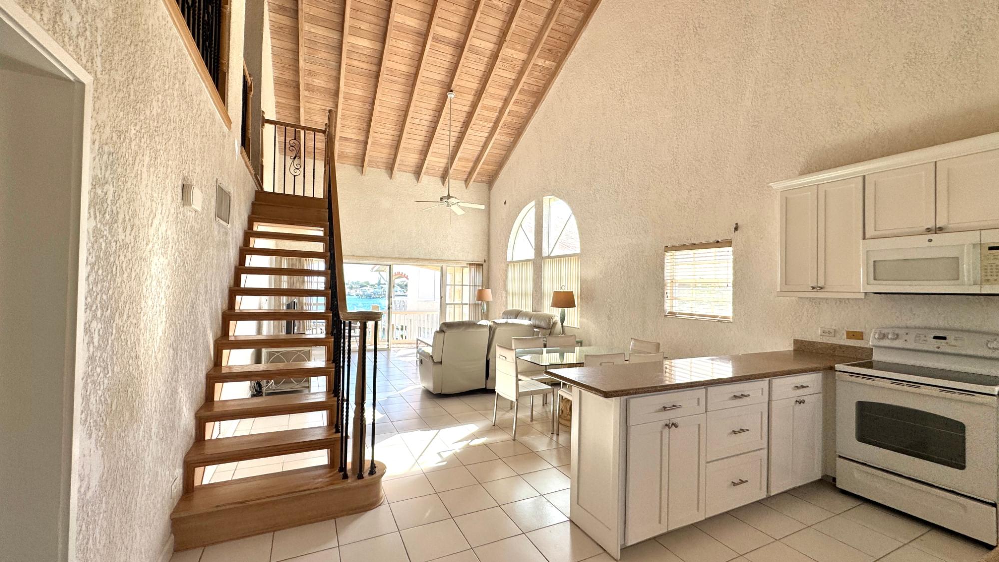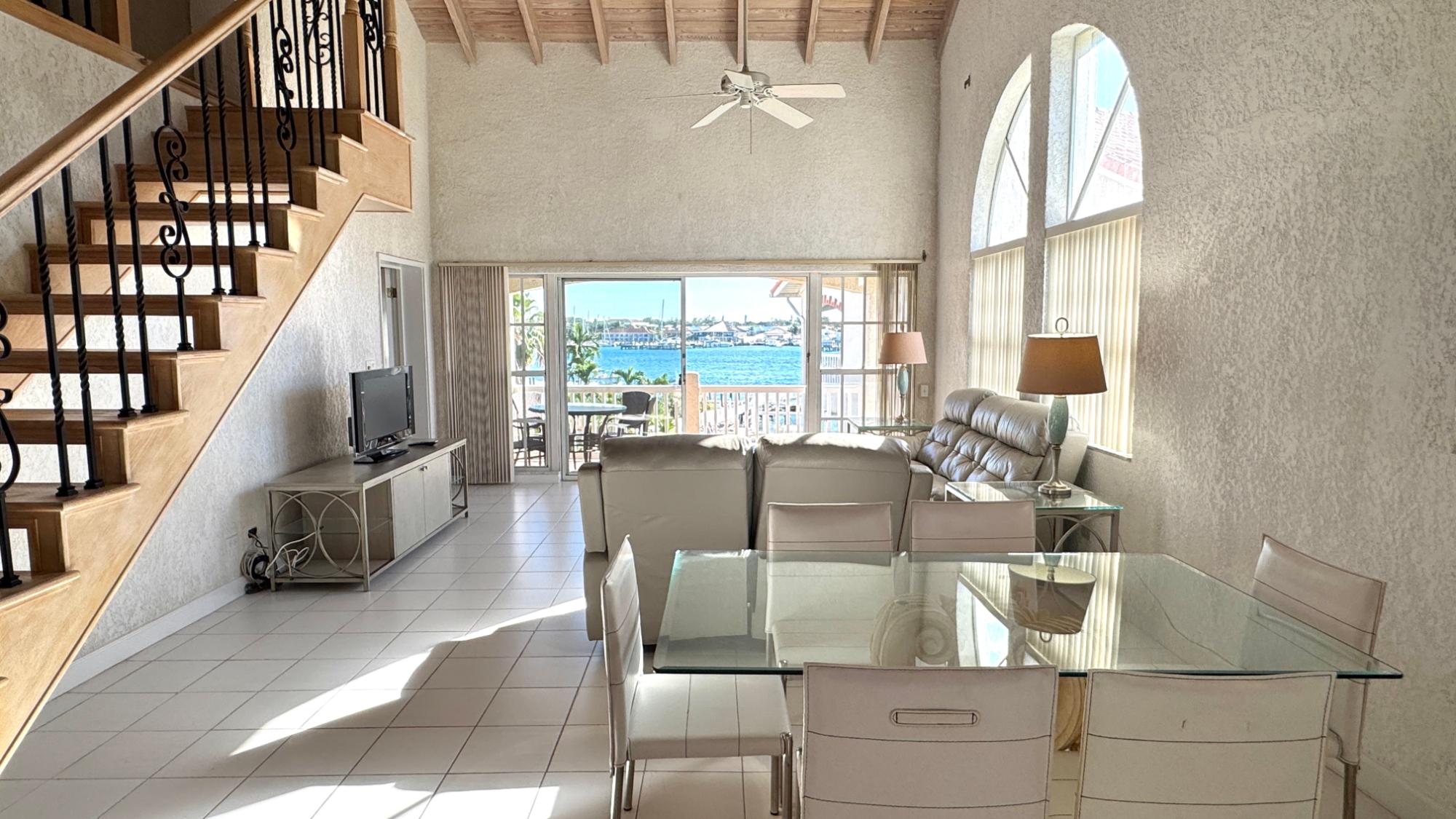 Top floor condo with high open beam ceilings is bright and breezy with open plan living areas capturing the beautiful harbour views. The renovated kitchen offers an abundance of counter space and cabinets with a large bar for easy meal prep and serving. The master suite is very spacious with a walk-in closet and a bathroom with delightful sea views from the shower! An attractive loft with skylights adds extra space for a home office, media room or guests. An optional dock space is available within the protected marina. Comfortably furnished, this Paradise Island penthouse is ready for immediate occupancy. Enjoy peaceful living on Paradise Island with all the amenities, including a new grocery store, restaurants, beaches, and a yoga retreat within walking distance.