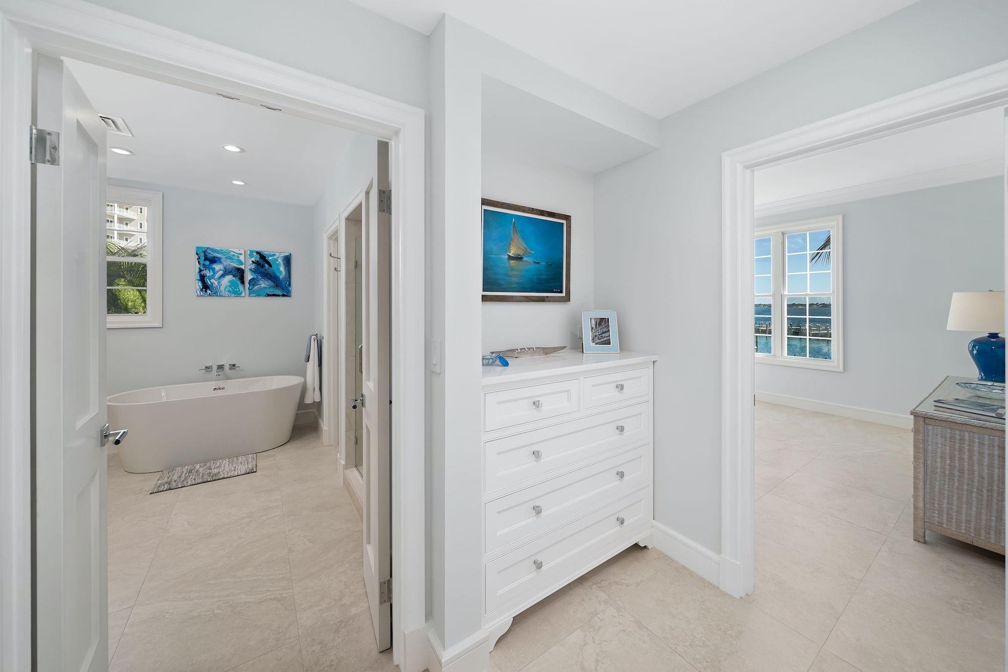 Seamlessly blending contemporary finishes with timeless sophistication, this impeccably remodeled second-floor corner residence in the gated enclave of Shangri-La on Paradise Island offers an exceptional lifestyle of elegance and privacy. Spanning approximately 2,600 square feet of refined living space, this three-bedroom, three-and-a-half-bath condominium presents an inspired design that elevates everyday living and entertaining. With sweeping water views that capture the character of Nassau Harbour and the protected marina, this residence embodies waterfront living at its finest—ideal for the discerning buyer seeking both serene retreat and effortless access to The Bahamas’ vibrant boating lifestyle. The open plan living and dining areas are framed by panoramic vistas. The contemporary kitchen showcases premium Wolf and Sub-Zero appliances, quartz countertops, custom shaker cabinetry, and marble backsplashes. Each en-suite bedroom offers abundant light and unique water views. A covered private terrace overlooks the marina with 180° sunrise and sunset panoramas.