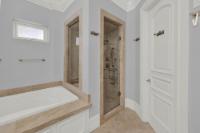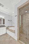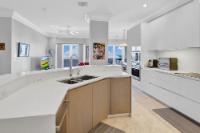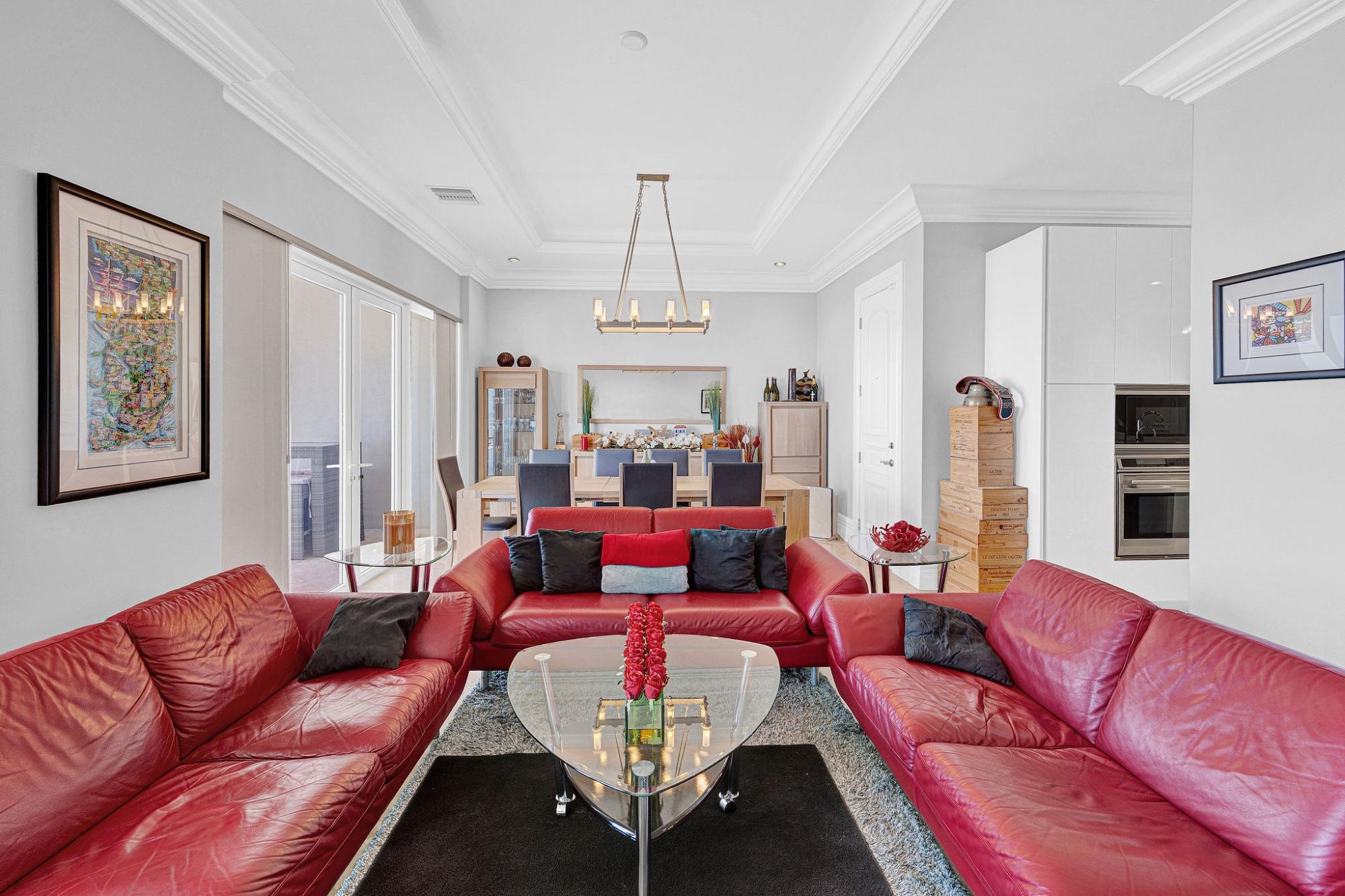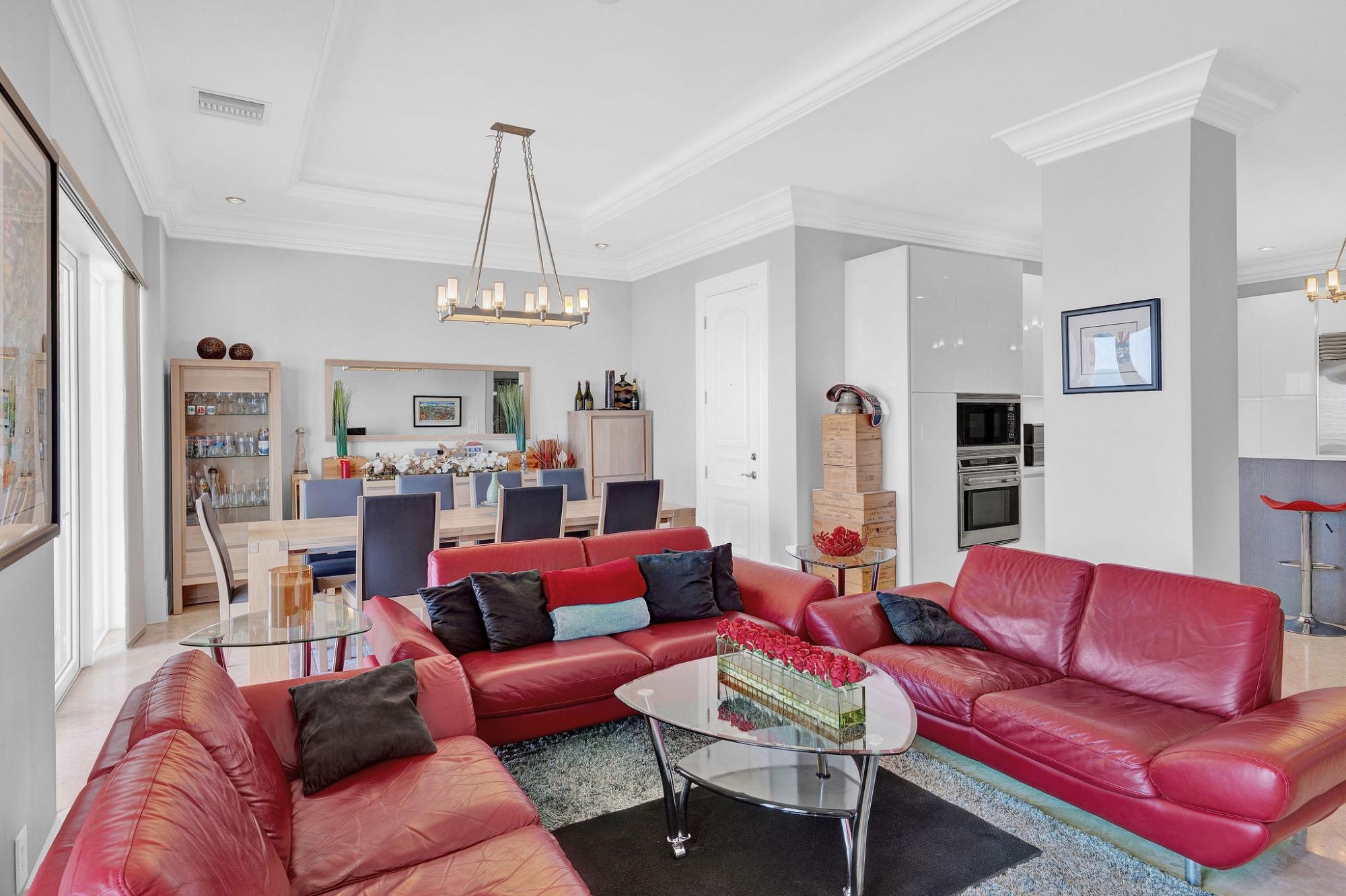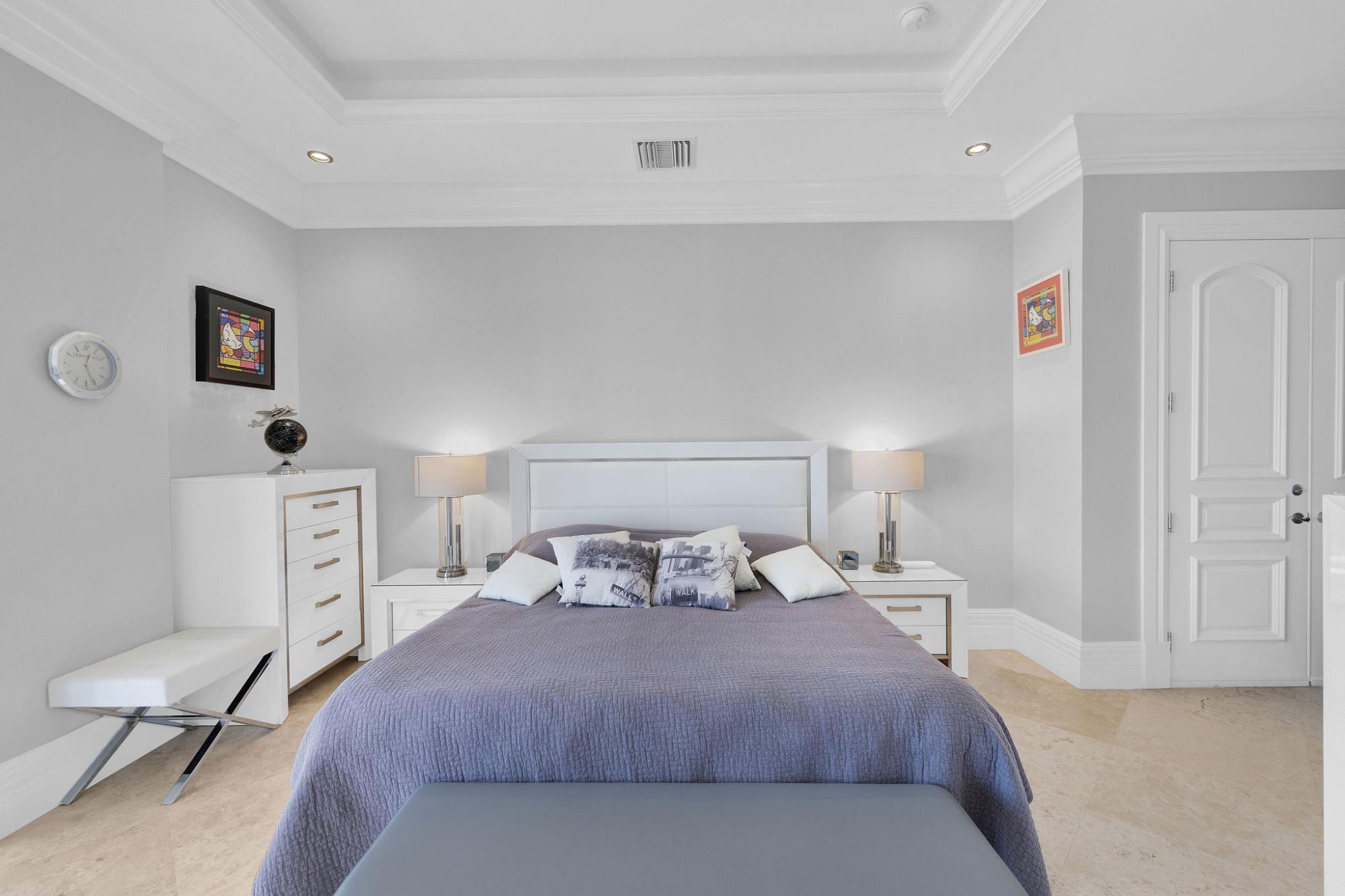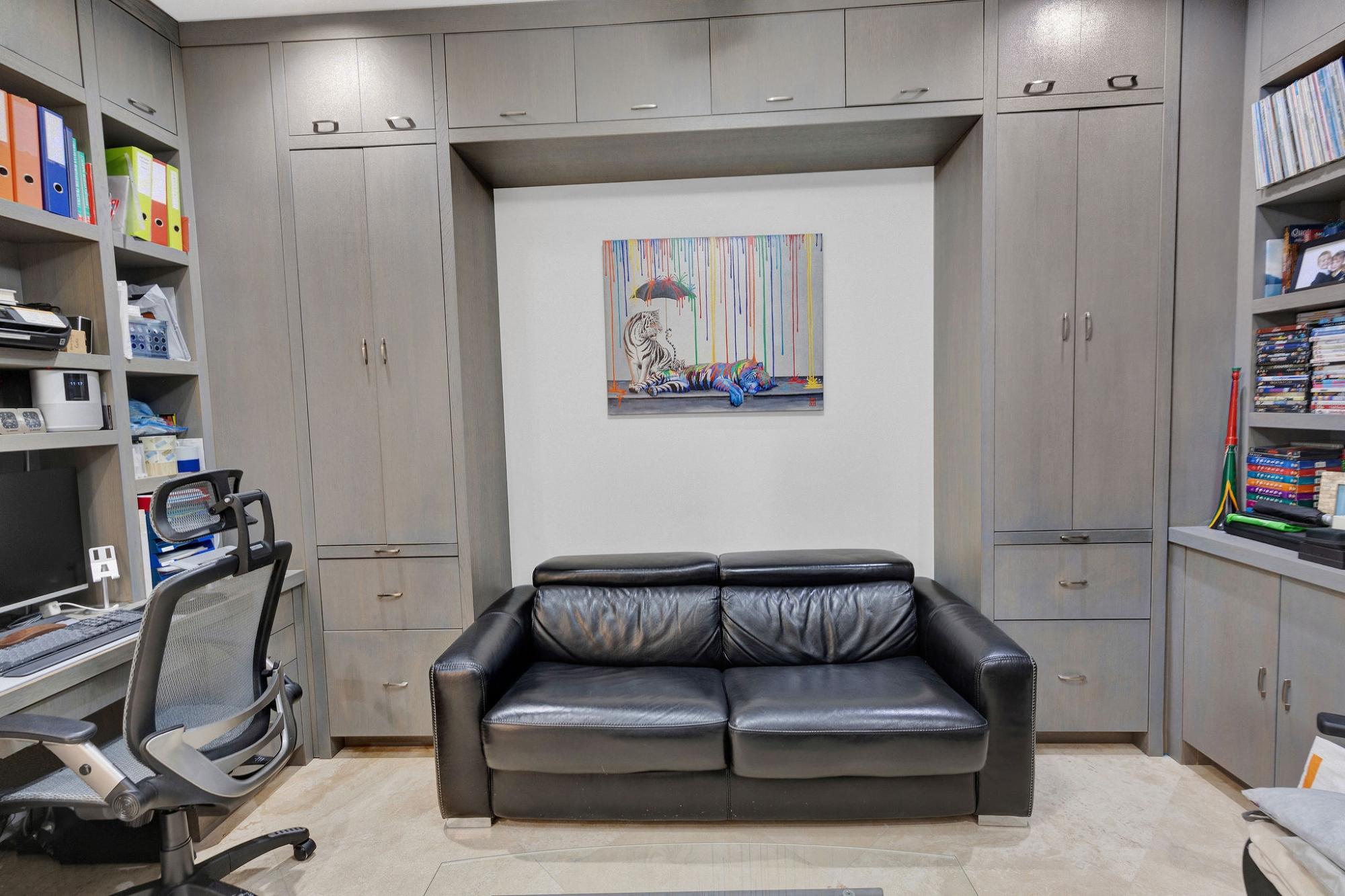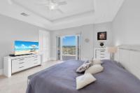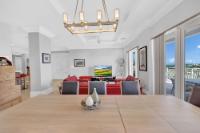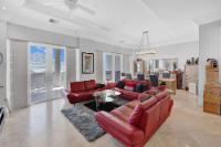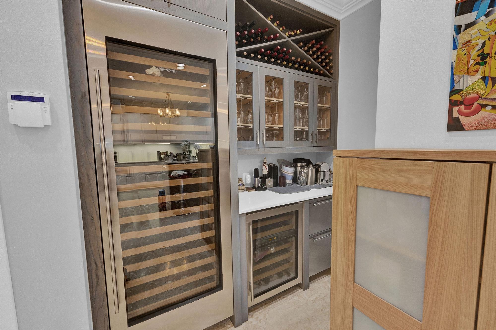 Situated on the fifth floor, this refined 3-bedroom, 2.5-bath residence offers sweeping ocean and golf course views across approximately 2,798 sq. ft. of elegant indoor-outdoor living. A private elevator opens directly into a bright, open-concept living area that flows seamlessly onto a spacious covered balcony, perfect for entertaining. The home showcases a custom Italkraft Italian kitchen designed as a social hub, featuring island seating, custom wine racks and glass shelving, two Sub-Zero wine refrigerators, and two Sub-Zero freezer drawers. The primary suite is a private retreat with balcony access, a custom walk-in closet, and a spa-style en-suite bath with Jacuzzi tub. A versatile den with custom cabinetry serves as a third bedroom or office. Upgrades include a monitored alarm system, GE TR5000 surge protection, Aquaboon 3-stage filtration, Pure H2O reverse osmosis, impact windows and doors, stone flooring, and a new LG washer and dryer. Two assigned parking spaces included.