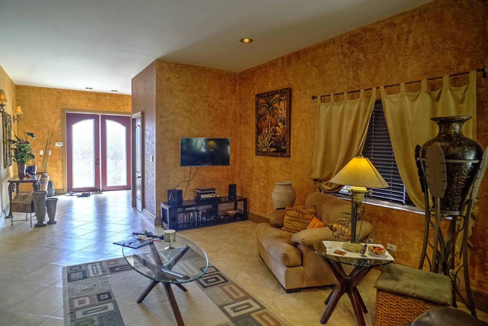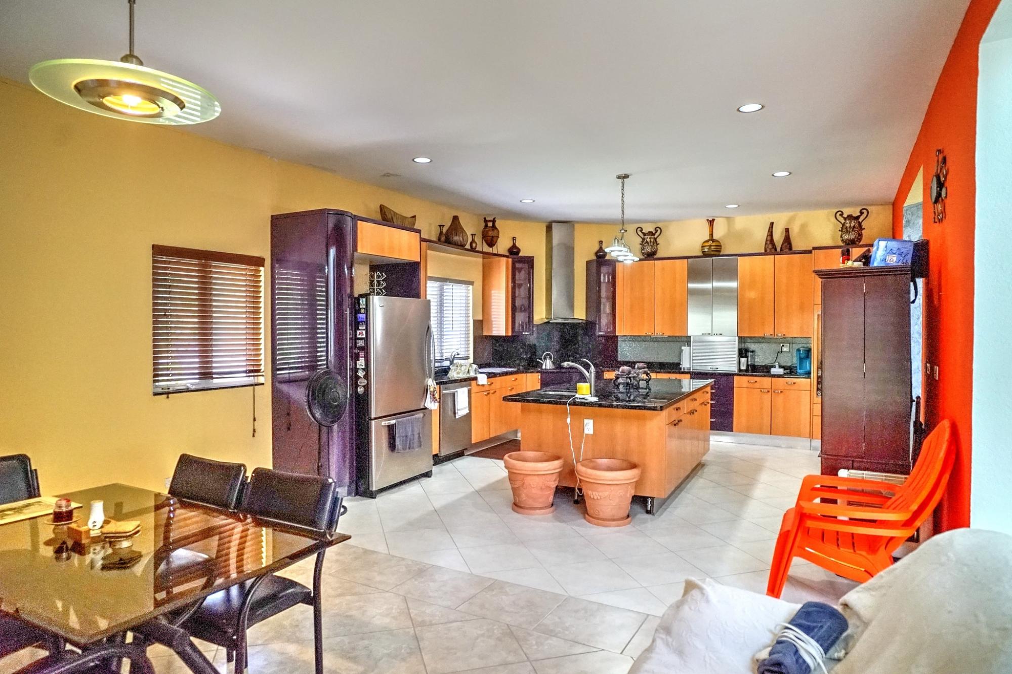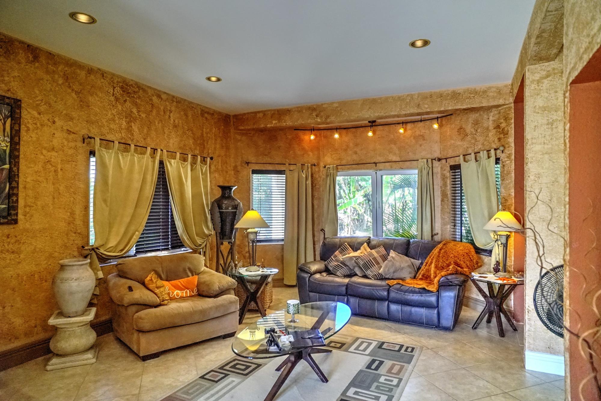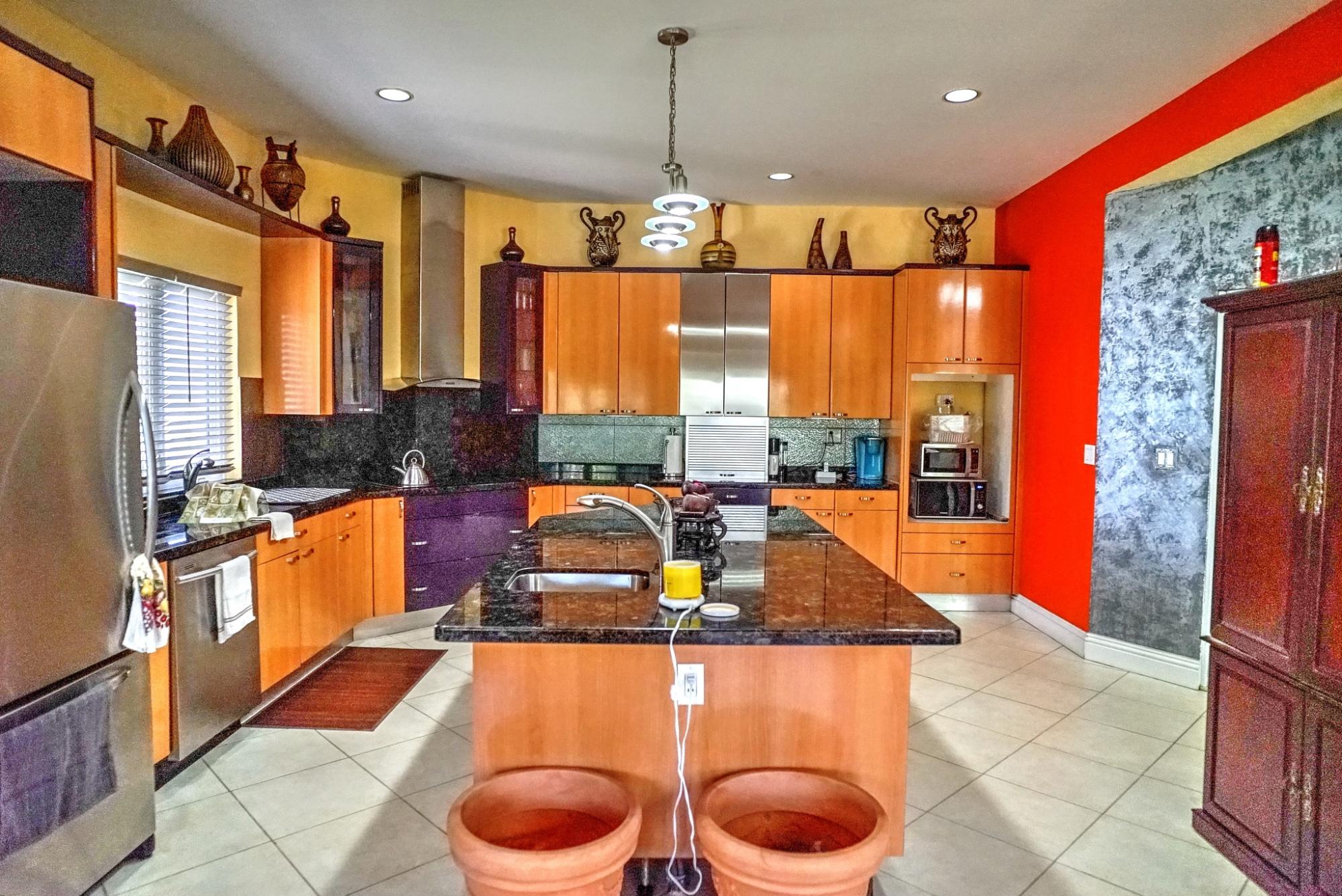 This Beautiful custom-built home offers three spacious bedrooms, two full bathrooms, and a convenient powder room downstairs; perfect for comfortable family living and entertainment. As you enter the foyer, your are greeted by impressive high ceilings and a bright, spacious living room overlooking the lush back garden. The private garden features mature native fruit trees, including avocado, mango and scarlet plum; creating a peaceful outdoor retreat. The home also include a cozy TV room located just off the kitchen and dining area. The modern kitchen features stainless steel appliances, maple and stainless steel cabinetry and elegant granite countertops. Additional conveniences include a laundry room and a two-car garage. Amenities include a standby generator, security system and camera monitoring system for added comfort and peace of mind.
